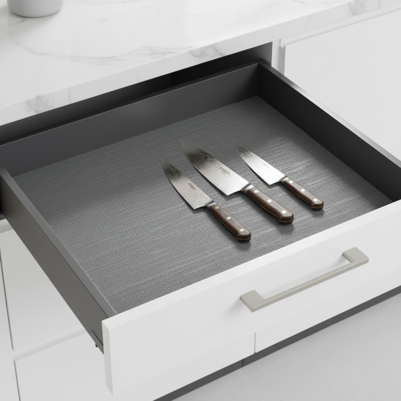 Organizer für Besteckschubladen mit rutschfester Oberfläche. Erhältlich in 7 Größen und kann auch zu Hause mit einem Schneidemesser zugeschnitten werden. Wählen Sie die Größe, indem Sie die Innenbreite der Schublade messen und die gewünschte Größe des Besteckeinsatzes entsprechend auswählen. Dann einfach zuschneiden, damit er genau in die Schublade...