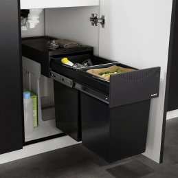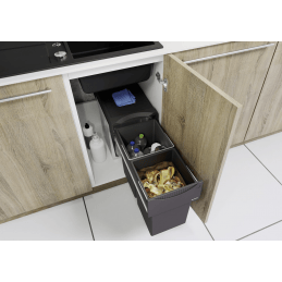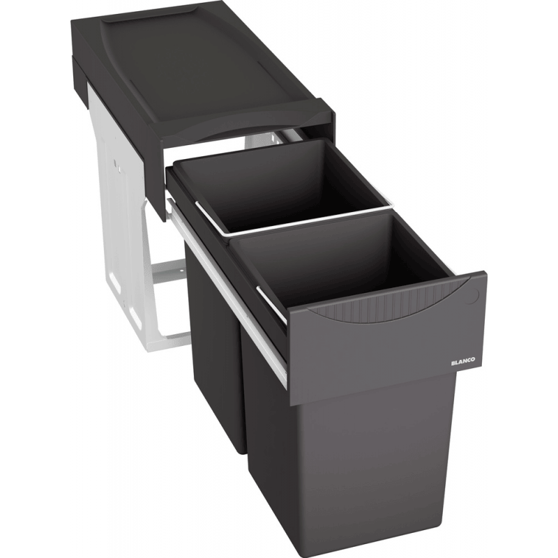 Blanco Botton II 30/2 ist ein praktisches Abfallsystem, das für den Einbau in den Küchenschrank bestimmt ist. Es bietet zwei Behälter mit jeweils 15 Litern Fassungsvermögen, was ausreichend Platz für die Mülltrennung auch in kleineren Küchen bietet.