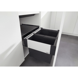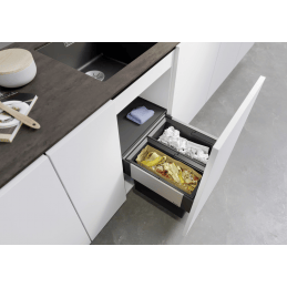 Das System ist für Unterschränke mit einer Breite von 45 cm bestimmt und ermöglicht eine bequeme Mülltrennung in separaten Behältern mit praktischen Griffen.