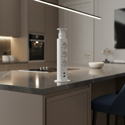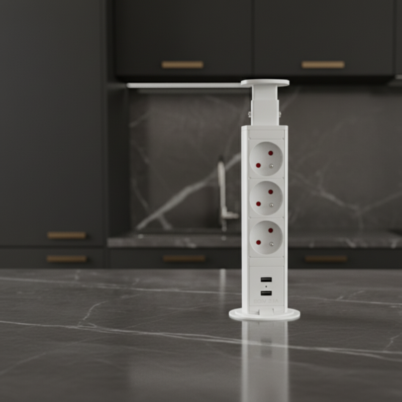 Die moderne versenkbare Steckdose in elegantem Weiß ist eine praktische Lösung für Küchen, Büros oder Schreibtische. Nach dem Drücken verschwindet sie in der Arbeitsplatte, spart so Platz und wirkt ästhetisch sauber. Mit einem Knopfdruck fährt sie heraus und ist sofort einsatzbereit.