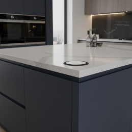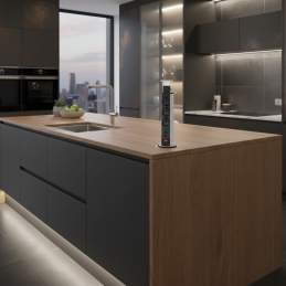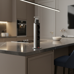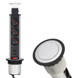 Die elegante versenkbare Steckdose im modernen Aluminiumdesign ist ein praktisches Zubehör für Küchen, Schreibtische und Büroräume. In eingefahrenem Zustand ist sie vollständig in der Platte verborgen und wirkt sauber und unauffällig. Mit einem einfachen Druck fährt sie heraus und ist sofort einsatzbereit.