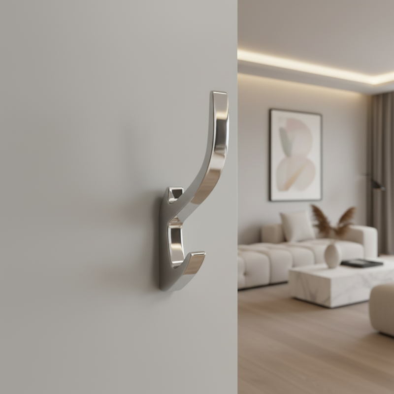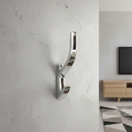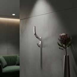 Der elegante und moderne KOS-Kleiderhaken in glänzender Chromausführung wirkt luxuriös und zeitlos. Dank seines klaren Designs und dezenten Glanzes ist er ideal für moderne sowie klassische Innenräume. Er bietet zwei praktische Haken, die sich zum Aufhängen von Kleidung, Handtüchern oder Accessoires eignen.