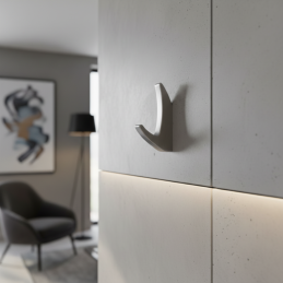 Kleiderhaken KOS Mini in elegantem gebürstetem Nickel Design ist das ideale Accessoire für moderne und klassische Innenräume. Die feine gebürstete Oberflächenstruktur verleiht dem Haken ein hochwertiges Aussehen und erhöht gleichzeitig die Kratzfestigkeit.