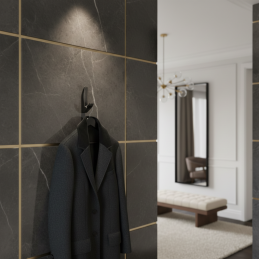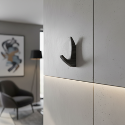 Moderner und eleganter Haken KOS Mini in der Ausführung schwarz gebürstet ist das ideale Accessoire für minimalistische, industrielle und luxuriöse Innenräume. Die fein gebürstete Oberfläche verleiht dem Haken ein hochwertiges mattes Aussehen und eine angenehme Textur. Die kompakte Größe sorgt dafür, dass er dezent wirkt, aber dennoch volle Funktionalität beim Aufhängen von Kleidung oder Accessoires bietet.