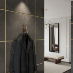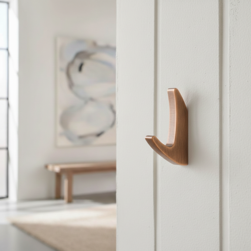 Der KOS Mini Kleiderhaken in elegantem gebürstetem Messing wirkt stilvoll, luxuriös und passt perfekt in Innenräume mit wärmeren Farbtönen oder Retro-Elementen. Die gebürstete Oberfläche verleiht dem Haken eine feine Textur und eine höhere Widerstandsfähigkeit gegen den täglichen Gebrauch.