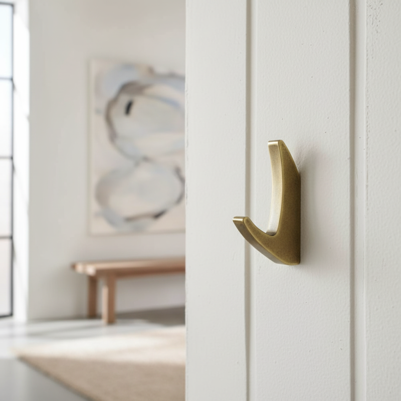 Der elegante und kompakte KOS Mini Kleiderhaken in zeitloser altgoldener Oberfläche ist die ideale Lösung für Flure, Bäder oder Garderoben. Dank seiner kleineren Größe wirkt er dezent, bietet aber dennoch ausreichend Platz zum Aufhängen von Kleidung oder Accessoires.