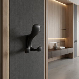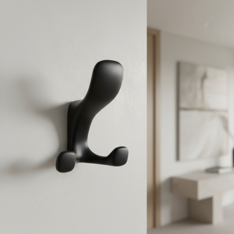 Das Design-Garderobenhaken MESSINA in eleganter Ausführung schwarz matt ist ein markantes und stilvolles Accessoire für moderne Innenräume. Sein organisches, fließend geformtes Design wirkt ästhetisch und zugleich praktisch, wodurch es zu einem funktionalen Detail und dekorativen Element wird.