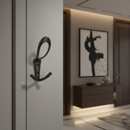 Eleganter und markanter Kleiderhaken BELAGO Maxi in der Ausführung schwarz matt ist eine moderne Lösung für stilvolles und funktionales Aufhängen von Kleidung. Sein verlängertes, fließend geformtes Design wirkt leicht und elegant, bietet jedoch gleichzeitig hohe Praktikabilität dank des unteren Doppelhakens.