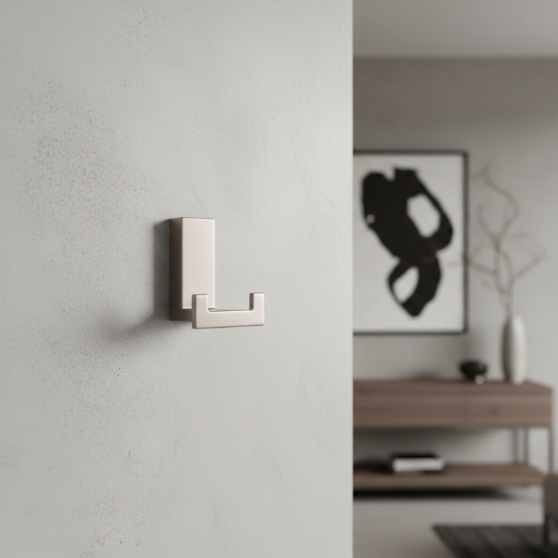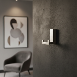 Kompakter und eleganter Design-Kleiderhaken in gebürstetem Nickel, der modern und zeitlos wirkt. Dank seiner kleineren Abmessungen ist er ideal für Flure, Badezimmer, Garderoben oder Möbel, bei denen ein klares Design und Funktionalität wichtig sind.