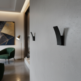 Moderner Designer-Kleiderhaken, der gleichzeitig auch als Möbelgriff – Knopf dienen kann. Dank der kompakten Maße und der sanft geschwungenen Form ist er ideal für minimalistische und moderne Innenräume. Geeignet für Schränke, Schubladen, Garderoben sowie Wände in Wohn- oder Geschäftsräumen.