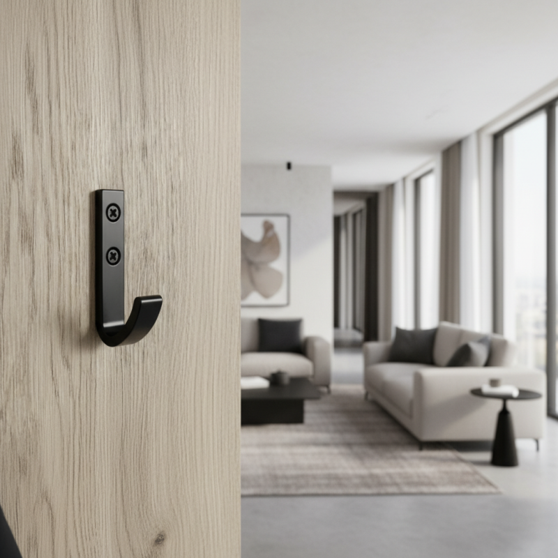 Der Haken ist aus hochwertigem Metall mit einer widerstandsfähigen matten Oberfläche gefertigt, die sich angenehm anfühlt und gleichzeitig gegen normale Abnutzung beständig ist. Die Form des Hakens ermöglicht ein sicheres Aufhängen von Kleidung, Handtaschen, Rucksäcken, Handtüchern oder Accessoires, ohne diese zu beschädigen.