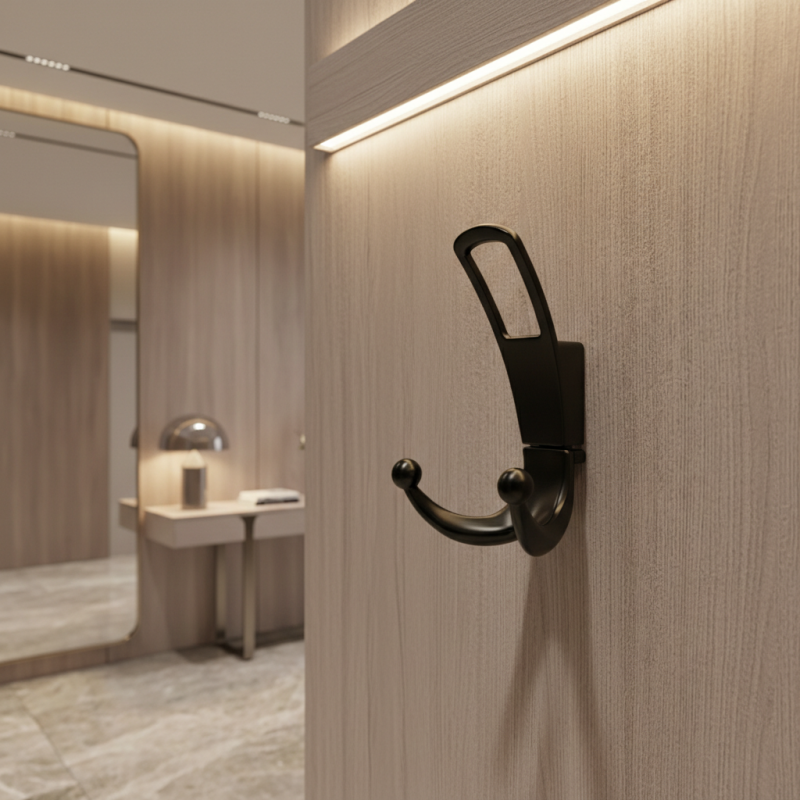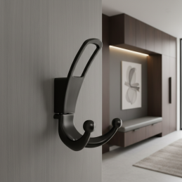 Der Haken LAMAR in schwarzer matter Farbe ist die ideale Wahl für Kunden, die eine Verbindung von modernem Design, Funktionalität und Widerstandsfähigkeit suchen.