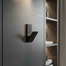 Moderner Design-Kleiderhaken TERZA in der Ausführung schwarz matt ist ein markantes und zugleich elegantes Accessoire für moderne sowie industrielle Innenräume. Seine geometrische Form mit schräger Linie wirkt dynamisch und bietet gleichzeitig einen zuverlässigen Platz zum Aufhängen von Kleidung oder Accessoires.