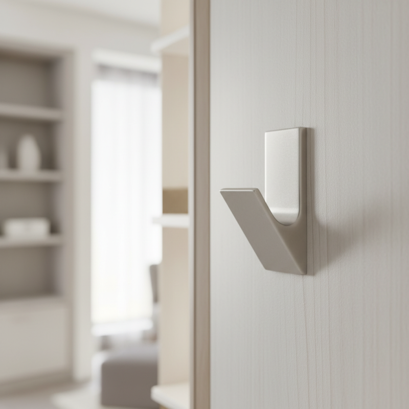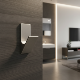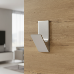 Der Haken TERZA in der Ausführung gebürstetes Nickel ist die ideale Wahl für Kunden, die eine Verbindung von modernem Design, hochwertiger Verarbeitung und unauffälliger Befestigung suchen.