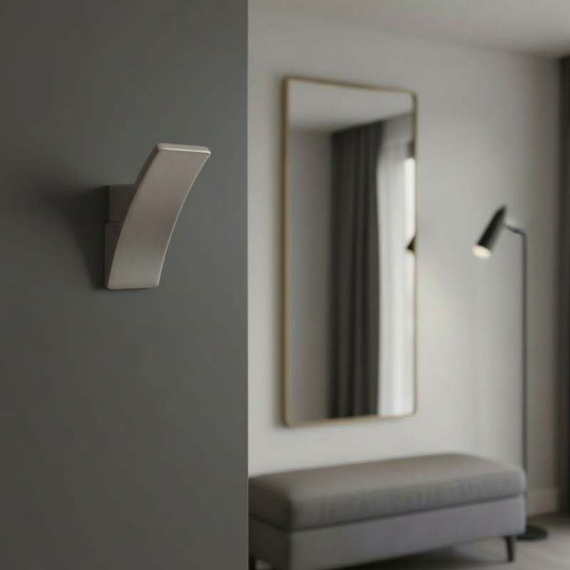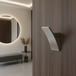 Moderner Design-Kleiderhaken in gebürsteter Nickel-Ausführung, der sich mit seinen klaren Linien sowohl in moderne als auch minimalistische Innenräume einfügt. Dank seiner Form kann er nicht nur als praktischer Haken, sondern auch als Möbelgriff – Knopf dienen.