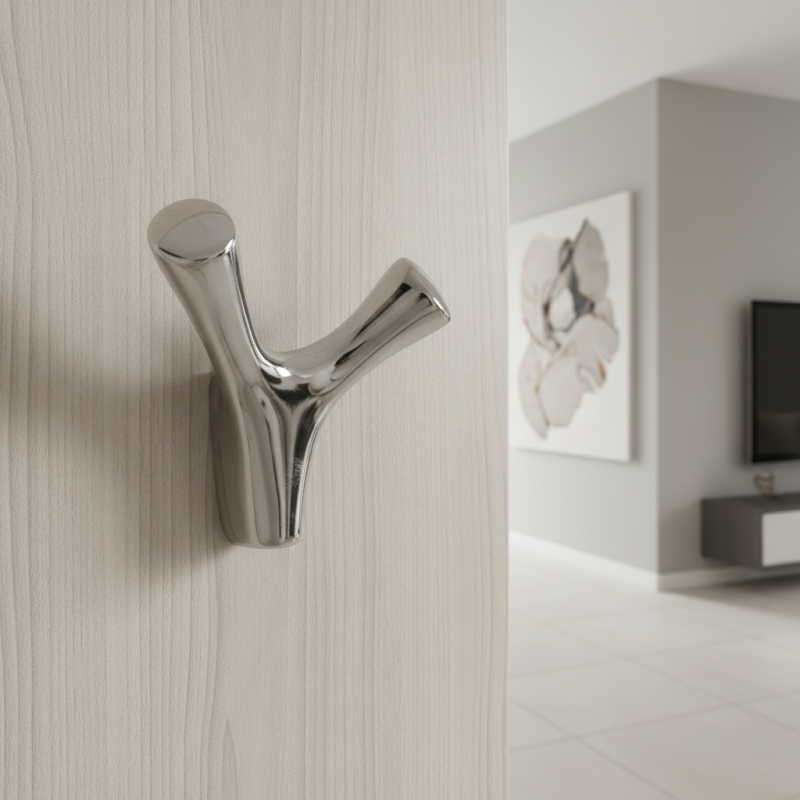 Glänzendes Chrom reflektiert das Licht wunderschön, wodurch die Garderobe nicht nur ein funktionales Element, sondern auch ein Designdetail ist, das sich für Flure, Bäder, Büros oder Hoteleinrichtungen eignet.