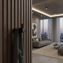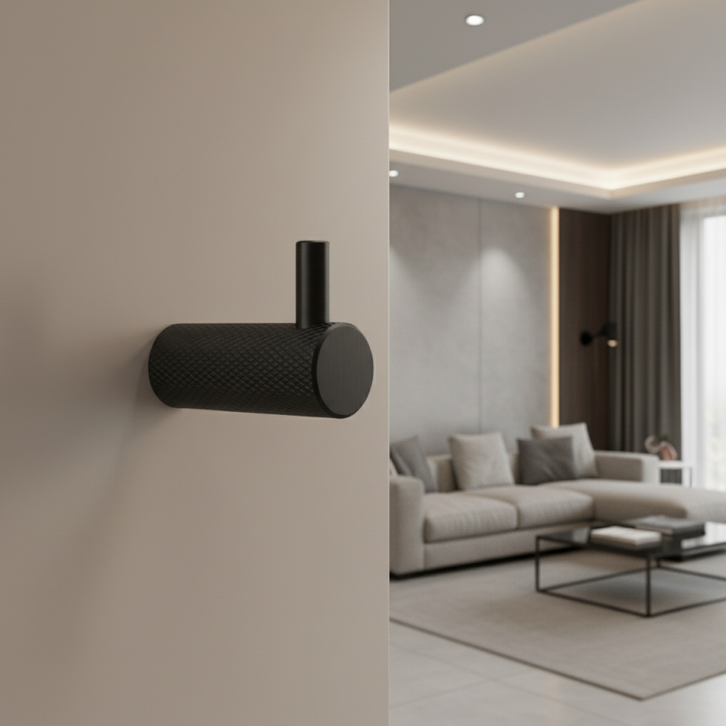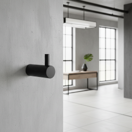 Die INDUST UNO Garderobe in stilvoller schwarz matter Oberfläche bringt ein klares industrielles Design mit markanter geriffelter (knurled) Struktur. Dank ihrer kompakten Form und eleganten Silhouette ist sie ideal für Flur, Bad, Küche, Kleiderschrank und Büro.