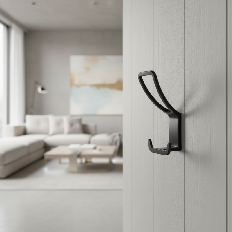 Der elegante und markante Kleiderhaken TANIA XL in mattem Schwarz ist eine moderne Lösung für jedes Interieur. Dank seiner zeitlosen Form wirkt er leicht, bietet aber gleichzeitig eine stabile und praktische Unterstützung für Kleidung, Taschen oder Accessoires.