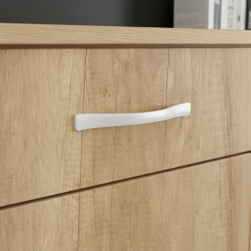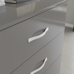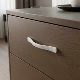 Der Griff NICOLA in mattweißer Ausführung ist eine moderne und elegante Lösung für Möbel im minimalistischen, skandinavischen oder klaren modernen Stil. Ihre sanft gewellte Form wirkt natürlich und ergonomisch, wodurch der Griff angenehm zu berühren und komfortabel im täglichen Gebrauch ist.