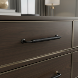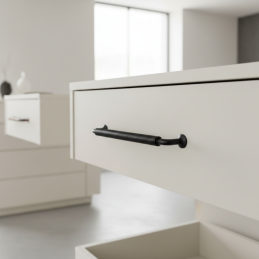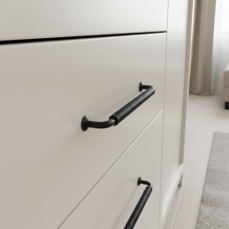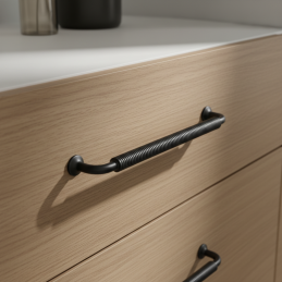 Der markante Möbelgriff STIGMA in der Ausführung schwarz matt besticht durch sein industrielles Design und den detailliert gearbeiteten, gerändelten Griff. Sein robustes Aussehen und die matte Oberfläche verleihen den Möbeln einen modernen, technischen Charakter, wodurch er ideal für Loft-, Industrie- und moderne Interieurs ist.