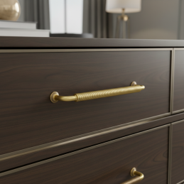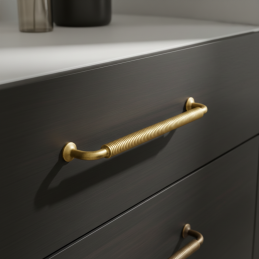 Das Design-Möbelgriff STIGMA in der Ausführung Altgold besticht durch seinen markanten industriellen Charakter und den präzise gerändelten Griff. Die Oberflächenbehandlung im Farbton Altgold verleiht dem Griff ein authentisches, leicht Vintage-ähnliches Aussehen, das sich hervorragend für industrielle, Loft- und rustikale Innenräume eignet.
