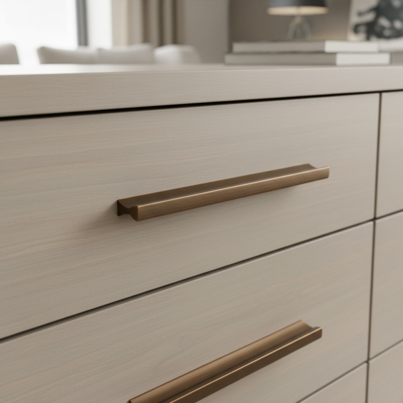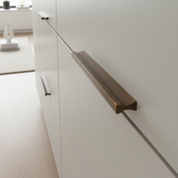 Der Griff PIREA in der Ausführung gebürstetes Messing ist ein Design-Accessoire, das Möbeln ein luxuriöses und schlankes, modernes Aussehen verleiht. Seine minimalistische Linie mit feiner ergonomischer Fräsung wirkt elegant, vermittelt einen klaren Eindruck und fügt sich natürlich in moderne Innenräume, High-End-Küchen oder Designermöbel ein.
