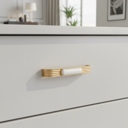 Der Keramikgriff FARO in eleganter Altgold-Optik ist ein markantes und dekoratives Accessoire, das Ihren Möbeln einen edlen und einzigartigen Look verleiht. Die Kombination aus hochwertiger Zinklegierung und weißem Porzellan schafft einen harmonischen Kontrast, während die charakteristische Profilierung des Griffs einen dezenten Vintage-Touch hinzufügt.