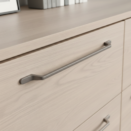 Der Griff ELIDA in der Ausführung Grau Satin ist ein modernes und elegantes Accessoire für zeitgemäße Innenräume. Seine lange, schlanke Form mit sanfter Abwinkelung an den Enden wirkt dynamisch und designorientiert, wobei der Griff seinen klaren, minimalistischen Charakter bewahrt. Die satinierte graue Farbe wirkt dezent, technisch und zeitlos, wodurch sie sich leicht mit hellen und dunklen Möbeln, Holz sowie lackierten Oberflächen kombinieren lässt.