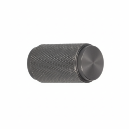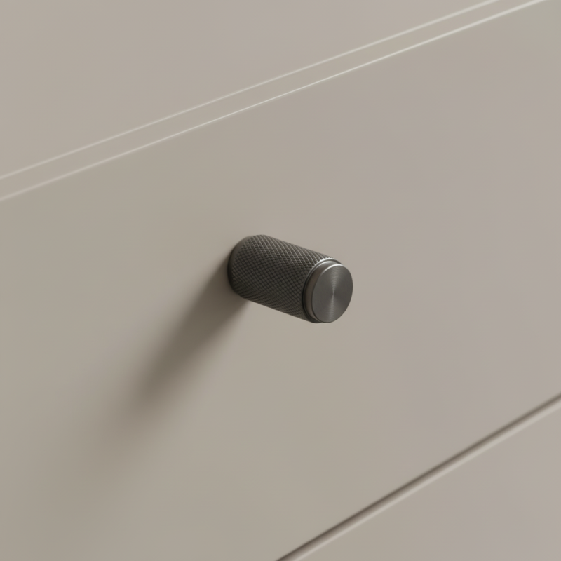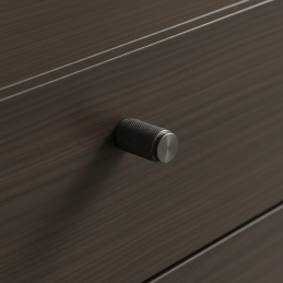 Der Knopf LAYLA in schwarzer Graphit-Ausführung ist ein modernes und technisch wirkendes Accessoire, das durch seine fein gerillte (knurled) Oberfläche besticht. Dieses Detail betont nicht nur den industriellen Charakter, sondern verbessert auch den Griff und den Komfort bei der täglichen Nutzung. Der matte Graphitton wirkt elegant und lässt sich hervorragend mit schwarzen, grauen, betonfarbenen und auch Holzmöbeln kombinieren.
