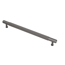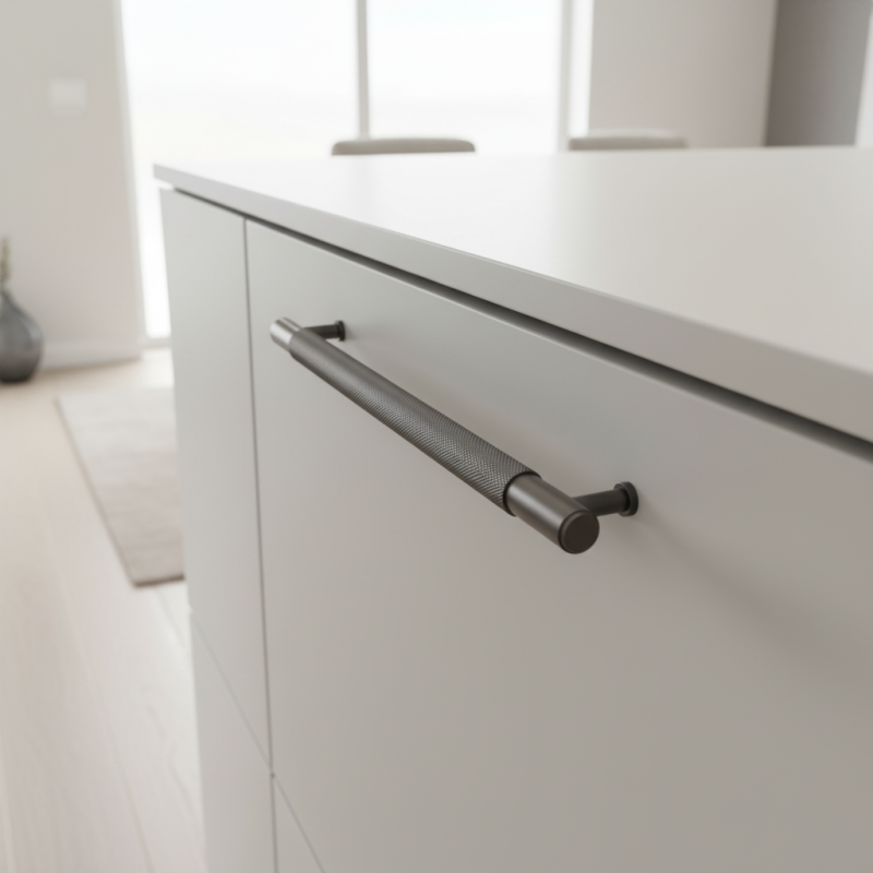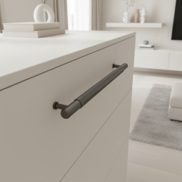 Der Griff LAYLA / Schwarzgraphit ist ein modernes und technisch wirkendes Designelement, das sich durch seine präzise Verarbeitung und seinen industriellen Charakter auszeichnet. Ein typisches Merkmal ist der fein gerändelte (Knurling) Mittelteil, der nicht nur ästhetisch auffällt, sondern auch den Griff verbessert. Die Endstücke haben eine glatte Oberfläche, was einen eleganten Kontrast und ein ausgewogenes Erscheinungsbild schafft.