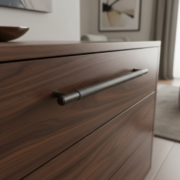 Die graphitschwarze Oberflächenbehandlung wirkt anspruchsvoll und zeitlos, wodurch sich der Griff hervorragend für moderne Küchen, Bäder, Garderoben, Kommoden sowie industriell gestaltete Innenräume eignet. Er kommt sowohl auf hellen als auch dunklen Möbeln, Holz, Laminat und lackierten Flächen bestens zur Geltung.