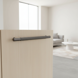 Der Griff LAYLA in Schwarzgraphit ist die ideale Wahl für alle, die ein modernes, funktionales und optisch markantes Detail mit Fokus auf Qualität, Ergonomie und Industriedesign suchen. Er lässt sich auch hervorragend mit dem Knopf LAYLA im gleichen Design für ein einheitliches Möbelbild kombinieren.