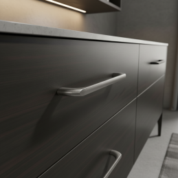 Dank seines universellen Designs eignet sich der Griff für Küchen, Bäder, Wohnzimmer, Garderoben sowie Büromöbel. Er kommt sowohl auf hellen als auch auf dunklen Oberflächen, Holz, Laminat und lackierten Türen hervorragend zur Geltung.