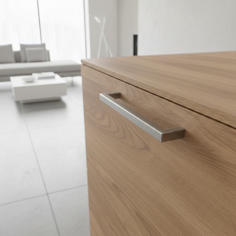 Der Griff SANA in Edelstahloptik ist ein praktisches und stilvolles Detail, das das klare Erscheinungsbild Ihrer Möbel unterstreicht.