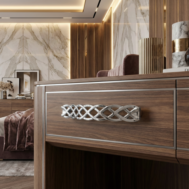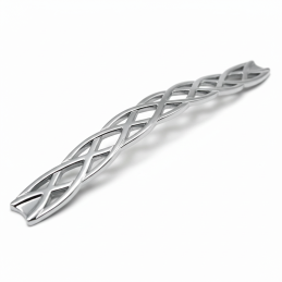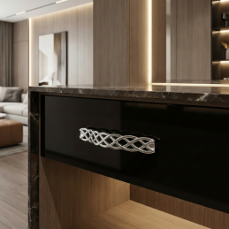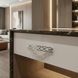 Der elegante Möbelgriff ALINA in glänzender Chromausführung besticht durch sein dekoratives Flechtmuster, das dem Möbelstück einen dezenten, aber markanten Charakter verleiht. Glänzendes Chrom wirkt modern, sauber und zeitlos, weshalb es sowohl in moderne als auch klassische Interieurs hervorragend passt.