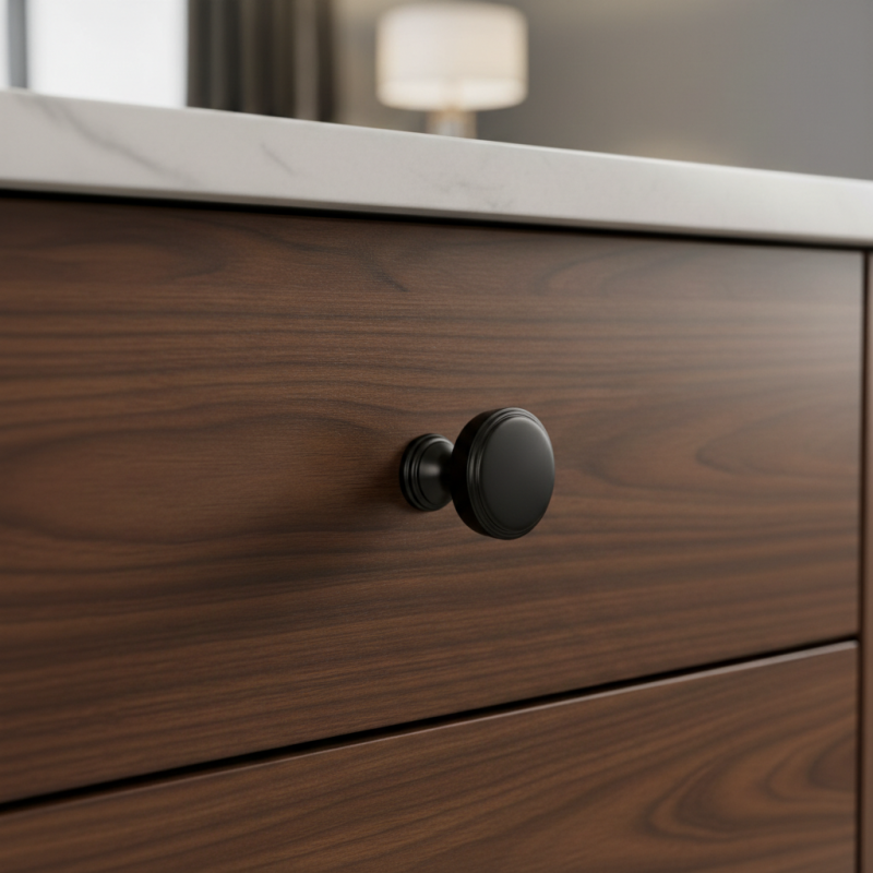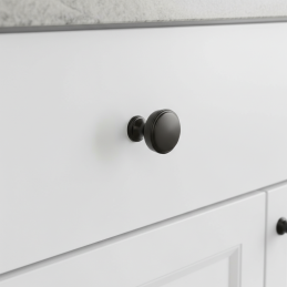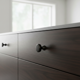 Die matte schwarze Oberfläche verleiht dem Griff einen raffinierten Charakter, eliminiert Reflexionen und ist pflegeleicht. Sie kommt sowohl auf hellen als auch auf dunklen Möbeln hervorragend zur Geltung und schafft ein kontrastreiches, designorientiertes Element.