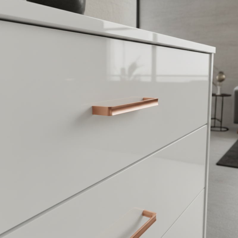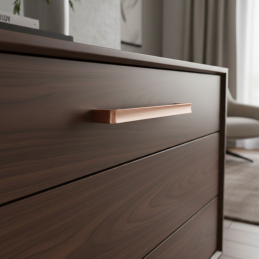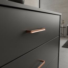 Der Griff SVOOP in der Oberflächenbehandlung Kupfer matt vereint eine minimalistische Form mit einem trendigen Farbschema, das den Möbeln einen eleganten, modernen und zugleich gemütlichen Charakter verleiht. Die klaren Linien und leicht abgeschrägten Kanten wirken raffiniert, während das matte Kupfer eine angenehme, warme Atmosphäre in jeden Innenraum bringt.