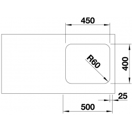 Die Spüle mit den Maßen 450 × 400 mm und einer Tiefe von 175 mm (Radius R60) bietet optimalen Platz für alltägliche Küchenarbeiten.