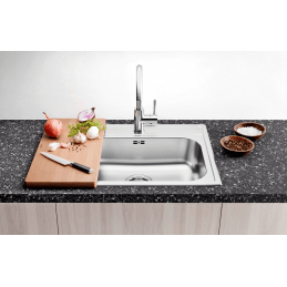 Blanco Dana 45 ist ein moderner Edelstahl-Einbeckenspüle, bestimmt für die Arbeitsplattenmontage. Dank seiner kompakten Abmessungen von 480 × 500 mm ist er ideal für kleinere Küchen oder Küchenzeilen mit einem Unterschrank ab 45 cm, ohne Kompromisse bei Qualität oder Ästhetik eingehen zu müssen.