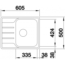 Die Spüle mit den Maßen 605 × 500 mm ist für die Montage auf der Arbeitsplatte oder flächenbündig (IF) vorgesehen und eignet sich für Unterschränke mit einer Mindestbreite von 45 cm.