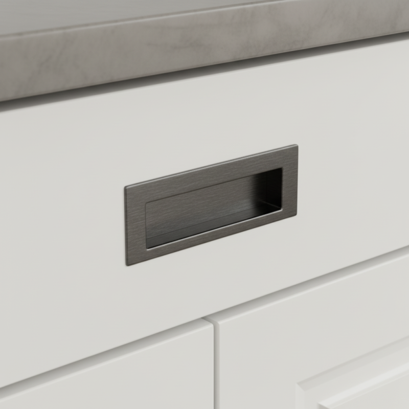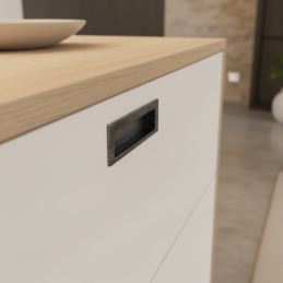 Eleganter minimalistischer Griff, der zum Einfräsen in die Oberfläche von Türen oder Schubladen bestimmt ist. In schwarzer gebürsteter Ausführung wirkt er modern, zeitlos und ergänzt perfekt Möbel im industriellen, minimalistischen sowie High-End-Interieur.
