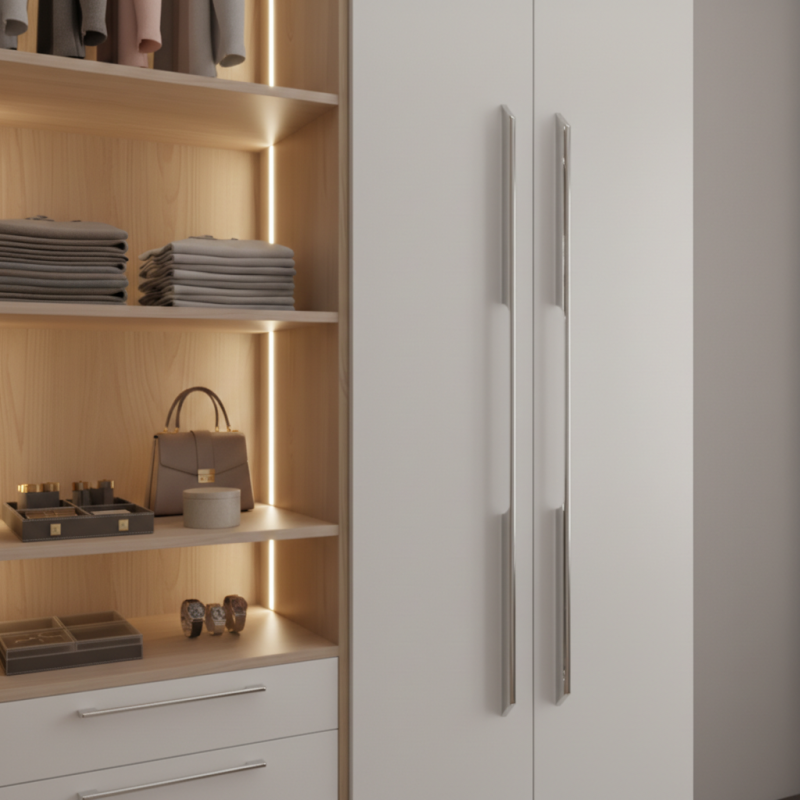 Eleganter Kleiderschrankgriff HANNA in der Ausführung glänzendes Chrom ist ein markantes Designelement für moderne Kleiderschränke und hohe Türen. Seine schlanke, minimalistische Form mit einer feinen Biegung im Winkel von 45° sorgt für ein klares, architektonisches Erscheinungsbild und gewährleistet gleichzeitig einen bequemen Griff.