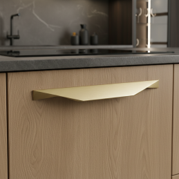 Die gebürstete goldene Oberfläche verleiht dem Griff ein exklusives Aussehen, das hervorragend mit Holz, weißen Flächen und matten Dekorplatten harmoniert.