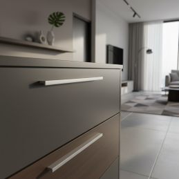 Der Griff SAXO in der Ausführung Aluminium ist eine moderne, minimalistische und sehr vielseitige Wahl für alle Möbeltypen. Dank des klaren, kantigen Designs wirkt er elegant und fügt sich perfekt in Küche, Bad, Wohnzimmer oder Büro ein.