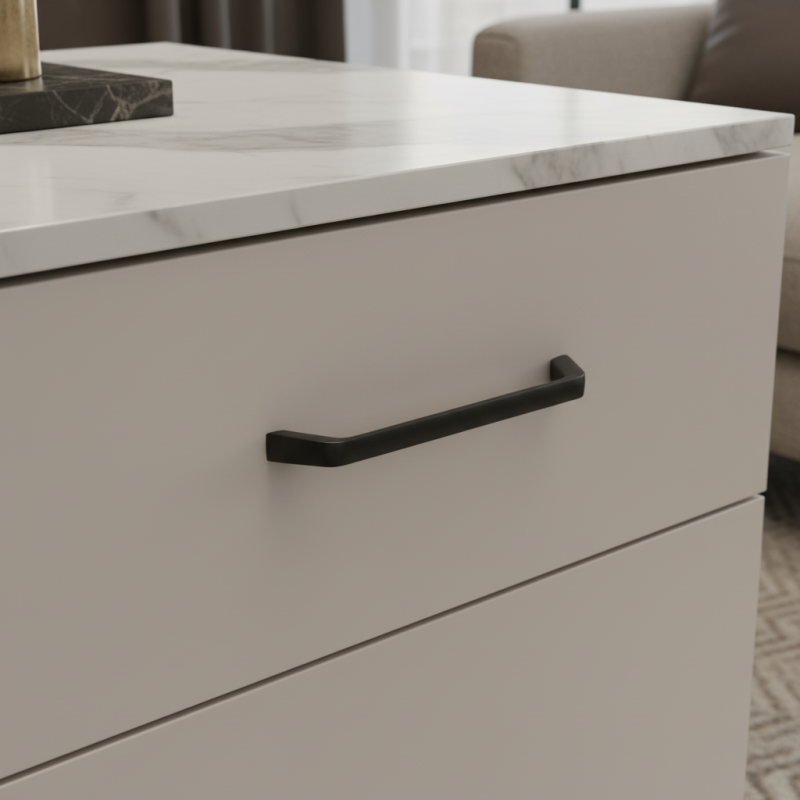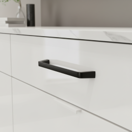 Der Griff SAMARA in schwarzer, matter Ausführung ist ein modernes und universelles Accessoire, das Möbeln ein klares, elegantes und zeitloses Aussehen verleiht. Seine leicht abgewinkelte Form wirkt dezent, aber dennoch markant, wodurch er sich hervorragend für minimalistische, industrielle und moderne Innenräume eignet. Die matte schwarze Farbe sorgt für einen raffinierten Kontrast auf hellen wie dunklen Möbeln und betont die Linien von Türen oder Schubladen.