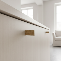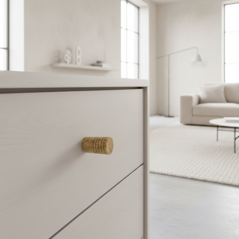 Der Holzknopf AURUS in der Ausführung lackierte Eiche stellt die perfekte Kombination aus natürlicher Ästhetik und modernem Detail dar. Seine zylindrische Form, ergänzt durch feine dekorative Rillen, wirkt stilvoll und bietet gleichzeitig einen bequemen Griff für den täglichen Gebrauch. Die lackierte Eiche betont ihre natürliche Maserung, verleiht der Oberfläche einen sanften Glanz und sorgt für dauerhafte Widerstandsfähigkeit.