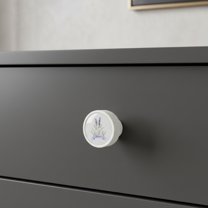 Holzgriff ARSIA in weißer Ausführung mit zartem Lavendelmotiv bringt einen Hauch von Romantik, Ruhe und französischem Provence in den Innenraum. Hergestellt aus massivem Buchenholz, lackiert in elegantem Weiß und ergänzt durch ein Aquarell-Lavendelmotiv wirkt er besonders harmonisch und stilvoll.