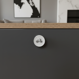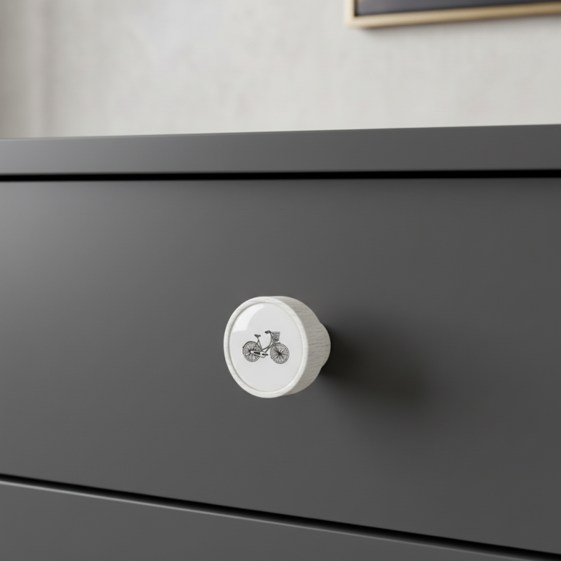 Der Holzgriff ARSIA in elegantem Weiß mit Fahrradmotiv ist ein stilvolles und originelles Accessoire für Möbel in modernen, Kinder- oder Retro-Interieurs. Massives Buchenholz ist glatt weiß lackiert und mit einer detailreichen Fahrradgrafik versehen, die verspielt und nostalgisch wirkt und dem Möbelstück einen einzigartigen Charakter verleiht.