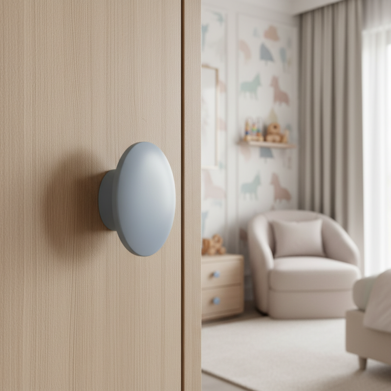 Einfacher und eleganter Holzgriff in modernem Blau, geeignet für Möbel im Kinderzimmer, moderne Innenräume oder als dezenter Farbakzent. Dank seiner Form liegt er angenehm in der Hand und eignet sich für Schränke, Schubladen und Kommoden.