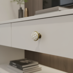 Eleganter Möbelknopf ORIENT in einer Kombination aus Porzellan und Metallbasis mit Oberfläche in Antikmessing. Das feine goldene Ornament auf weißem Hintergrund verleiht dem Griff ein luxuriöses und zugleich romantisches Aussehen. Die ideale Wahl für rustikale, Vintage- und Provence-Interieurs.